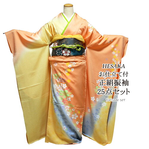 購入 25点 セット 京友禅 正絹 振袖 / オレンジ 桜 成人式 ふりそで 振袖 袋帯 長襦袢 重ね衿 帯締 帯揚 草履 バッグ ショール 着付け小物 着物スリップ 足袋 { 振袖 振り袖 成人式