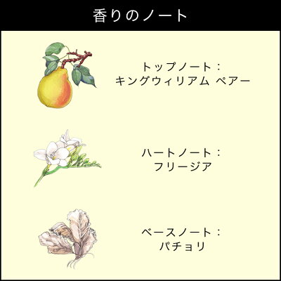 英国の果樹園で収穫した熟したての洋梨の官能的なみずみずしさを白いフリージアのブーケで優しく包み、アンバー、パチョリ、ウッドで豊潤に仕上げています。