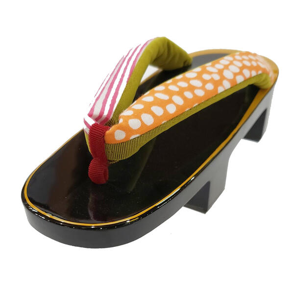 水玉とストライプの花緒に艶のある黒塗り2枚歯桐芳町下駄。