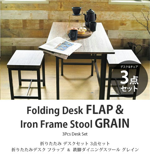 折りたたみ デスクセット 3点セット折りたたみデスク フラップ & 鉄脚ダイニングスツール グレイン Folding Desk FLAP & Iron Frame Stool GRAIN 3Pcs Desk Set 折りたためるデスクをお得なセットで 幅100cmとワイドな天板のデスクと鉄脚スツールをお得なセットにました。